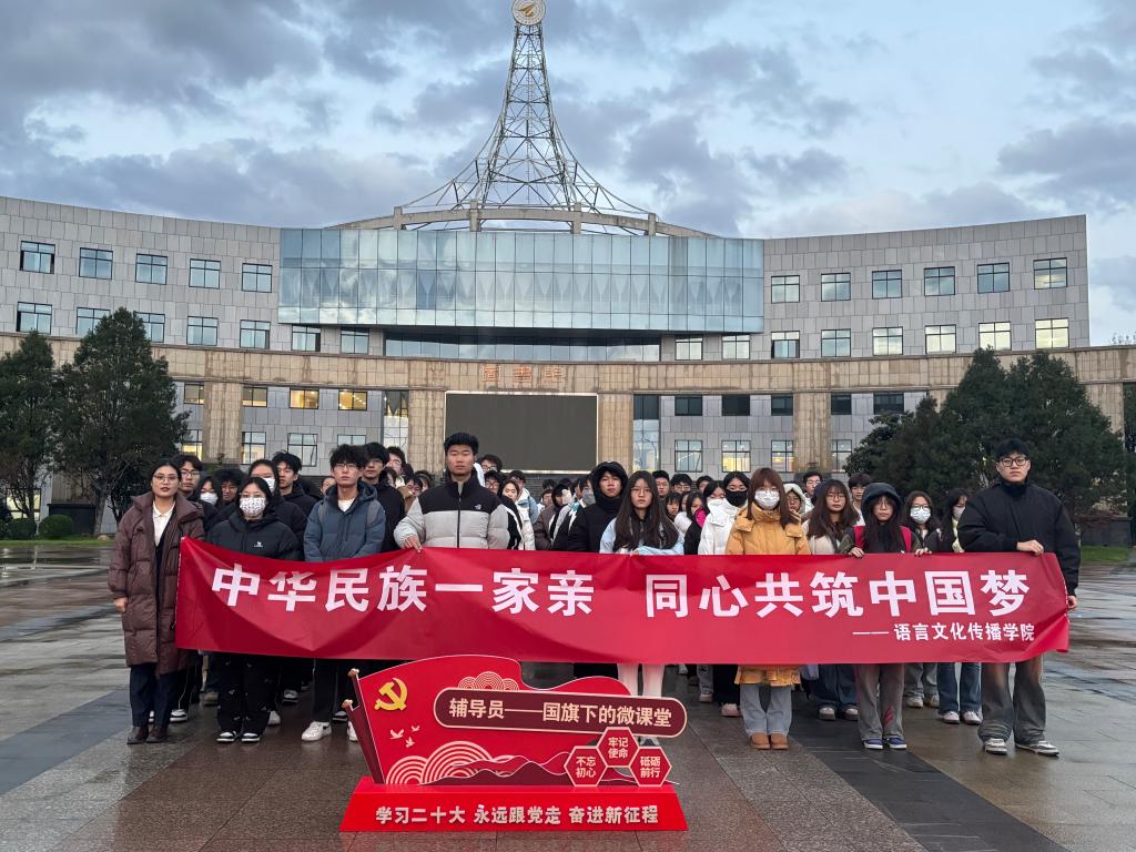11月25日,“辅导员说成长”——辅导员讲微课“铸牢中华民族共同体意识,新时代大学生的使命与担当”国旗下的微课堂爱国主义教育系列活动在学校中心广场进行,党委学生工作部老师、语言文化传播学院师生代表参加活动。