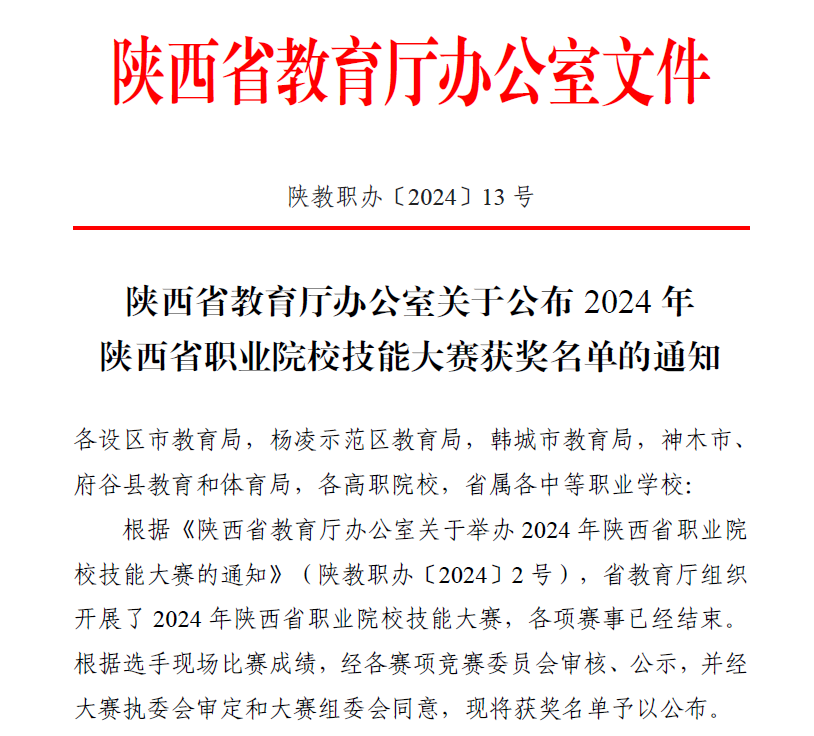 近日,陕西省教育厅公布了2024年省职业院校技能大赛获奖名单,学校获二等奖2项,三等奖4项,师生获奖17人次,这一成绩创下了学校历史新高。